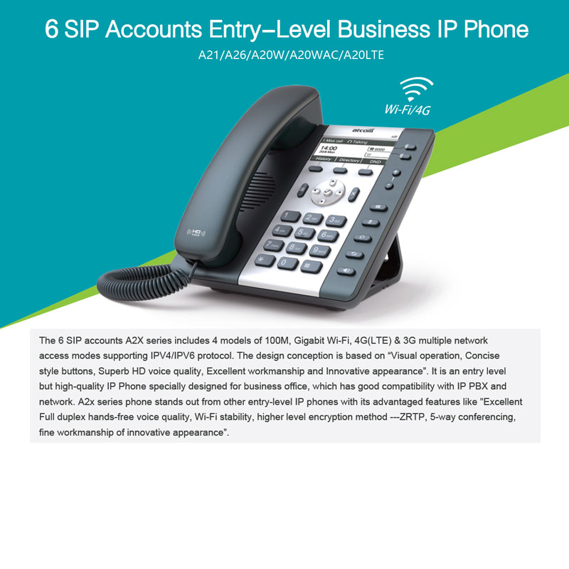 A20-LTE is a LTE IP Phone with 6 SIP accounts used in 4G(LTE) and 3G network environments. It also supports wired network access under IPv4 and IPv6 protocol. Its design concept is based on "Visual operation, excellent voice quality, exquisite detail and unique appearance".