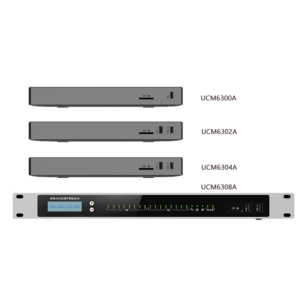 UCM6304A: Support Max 1000 SIP Users ,Max 150 Concurrent calls Max 120 concurrent SRTP calls ,200 SIP trunk Support 7 meeting rooms and up to 120parties With 4FXO+4FXS port , 2*USB 3.0, 1*SD card interface | UCM6308A: Support Max 1500 SIP Users ,Max 200 Concurrent calls Max 150 concurrent SRTP calls ,200 SIP trunk Support 9 meeting rooms and up to 150parties With 8FXO+8FXS port , 2*USB 3.0, 1*SD card interface |